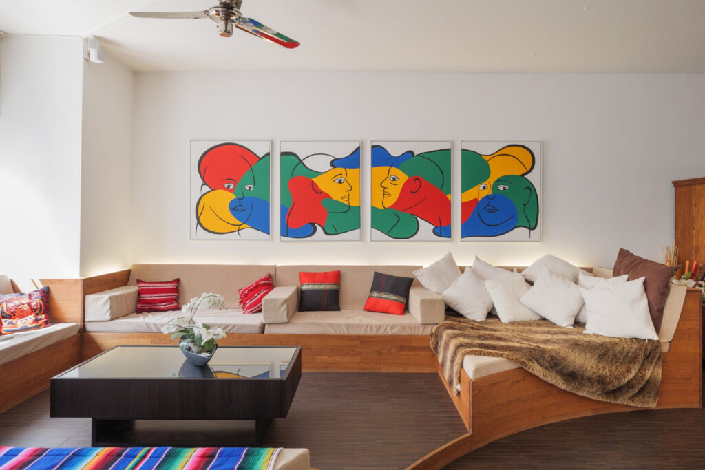 - Farbkonzept: Lebendiges und kunstvolles Farb- und Innenarchitekturkonzept: Z.B. Farbige Wände und Nischen in den Wänden