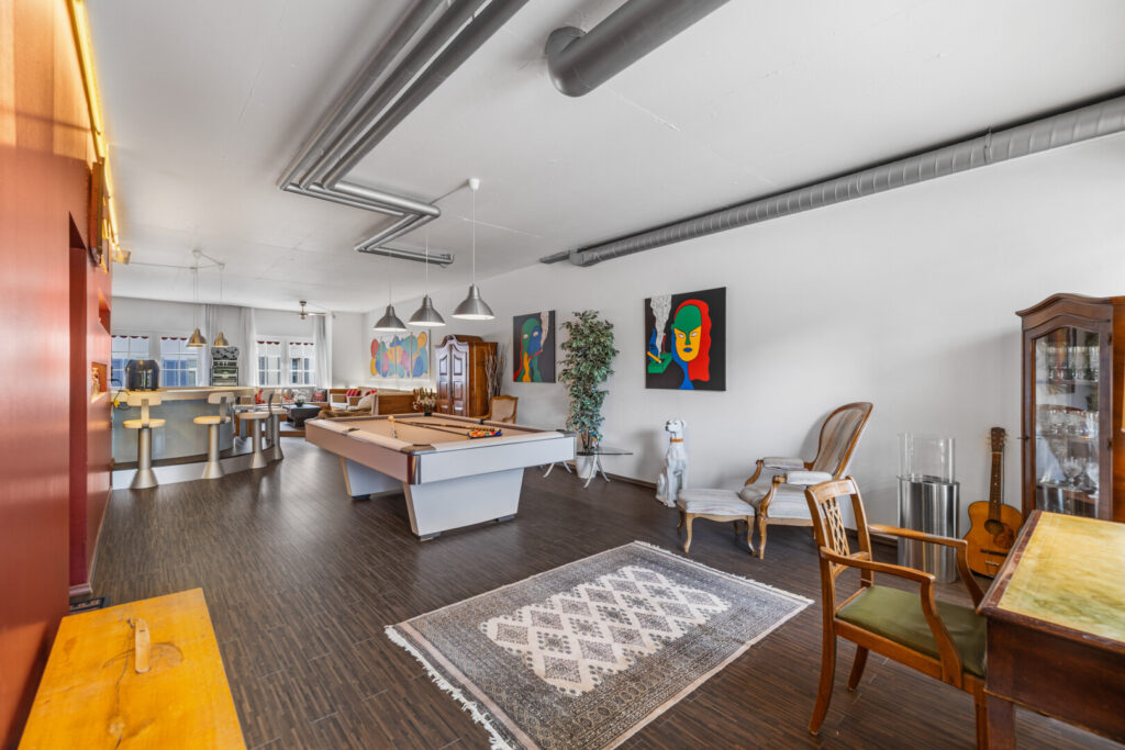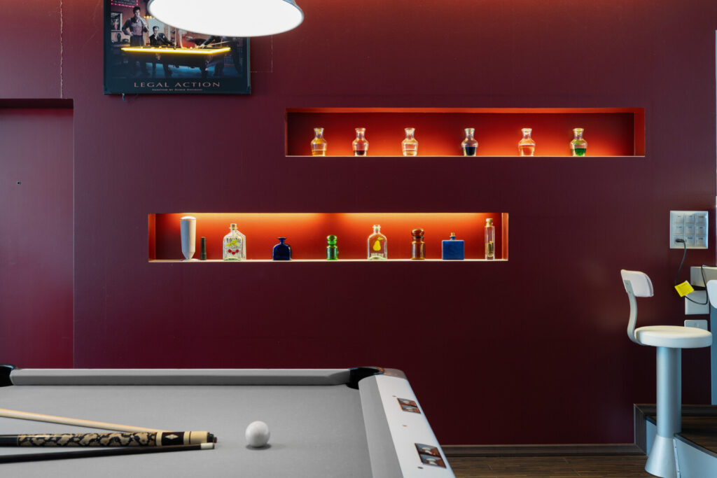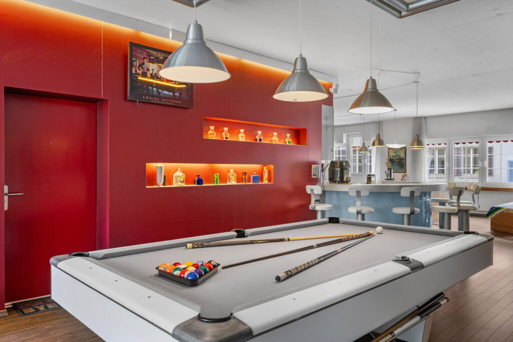 Das durchdachte Farb- und Innenarchitekturkonzept verleiht der Wohnung eine künstlerische Note: farbige Wände, raffinierte Nischen und ein offenes Raumgefühl sorgen für eine unverwechselbare Atmosphäre. Besondere Highlights sind die Rundbar, ein erhöhtes Wohnzimmer, ein stilvoller Billardbereich sowie eine gemütliche Sitznische.