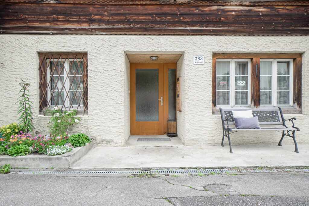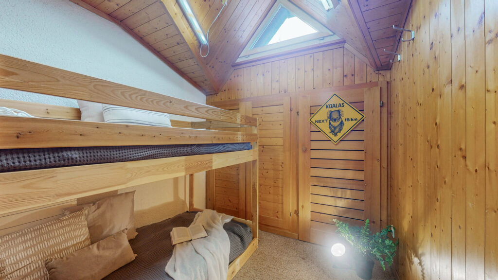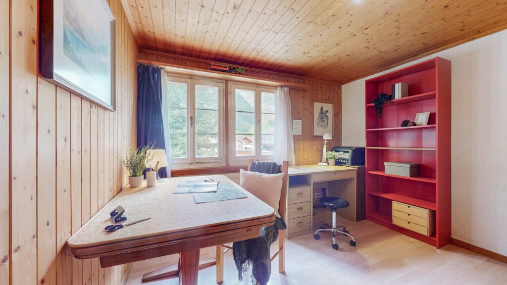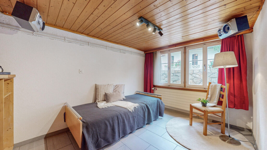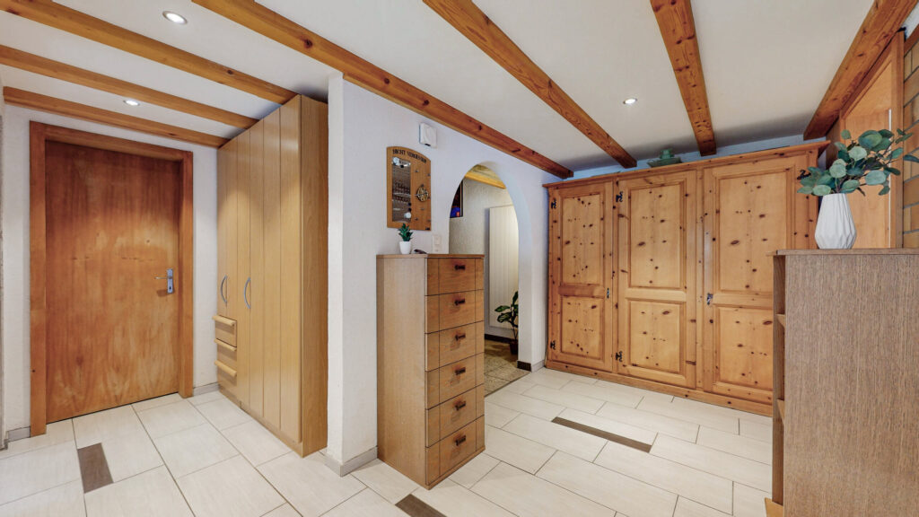 Dank laufender Sanierungen präsentiert sich das Chalet in gutem Zustand. Das Materialisierungskonzept verbindet klassische Elemente wie den gemütlichen Trittofen mit zeitgemässen Details, etwa der grosszügigen modernen Küche mit viel Stauraum und Arbeitsfläche. Insgesamt stehen drei Nassbereiche zur Verfügung – zwei Bäder mit WC sowie eine Gästetoilette – was für zusätzlichen Komfort sorgt.