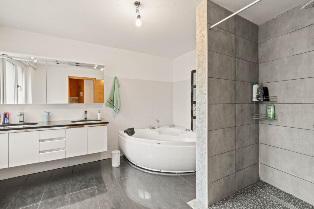 • Familienbad: Badewanne mit Whirlpool-Funktion, Walk-in Dusche, und zwei Lavabos