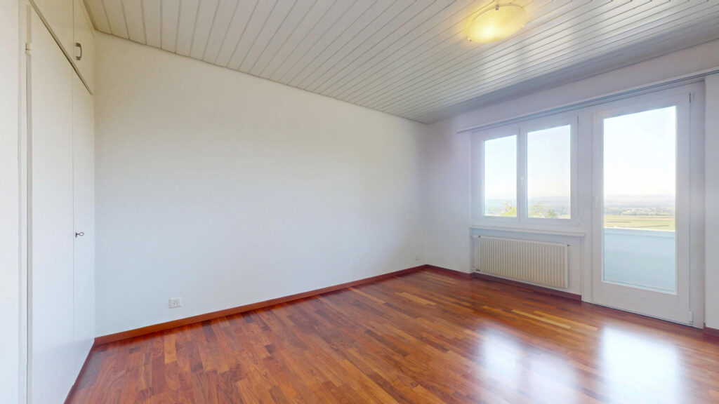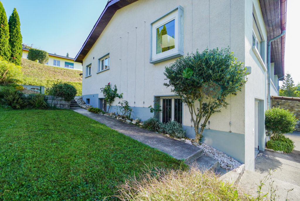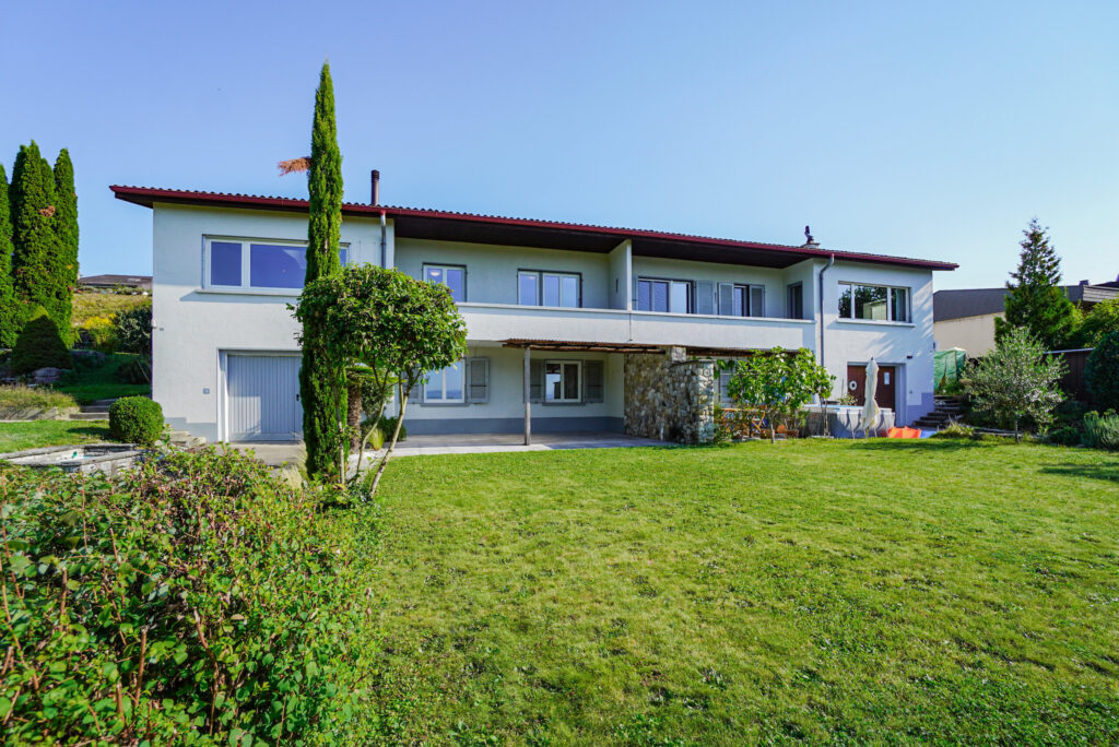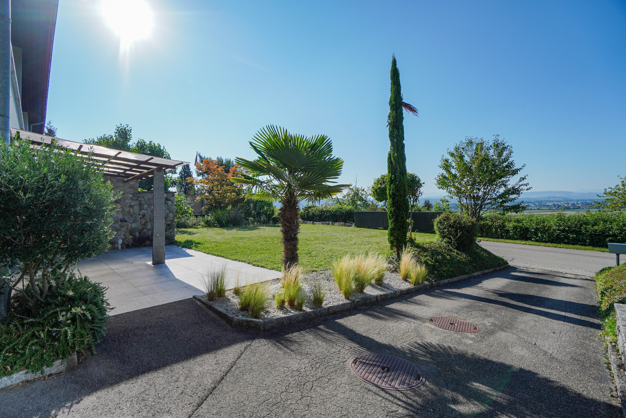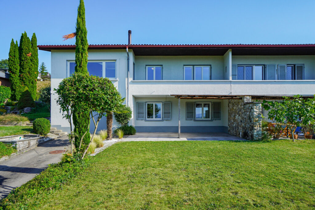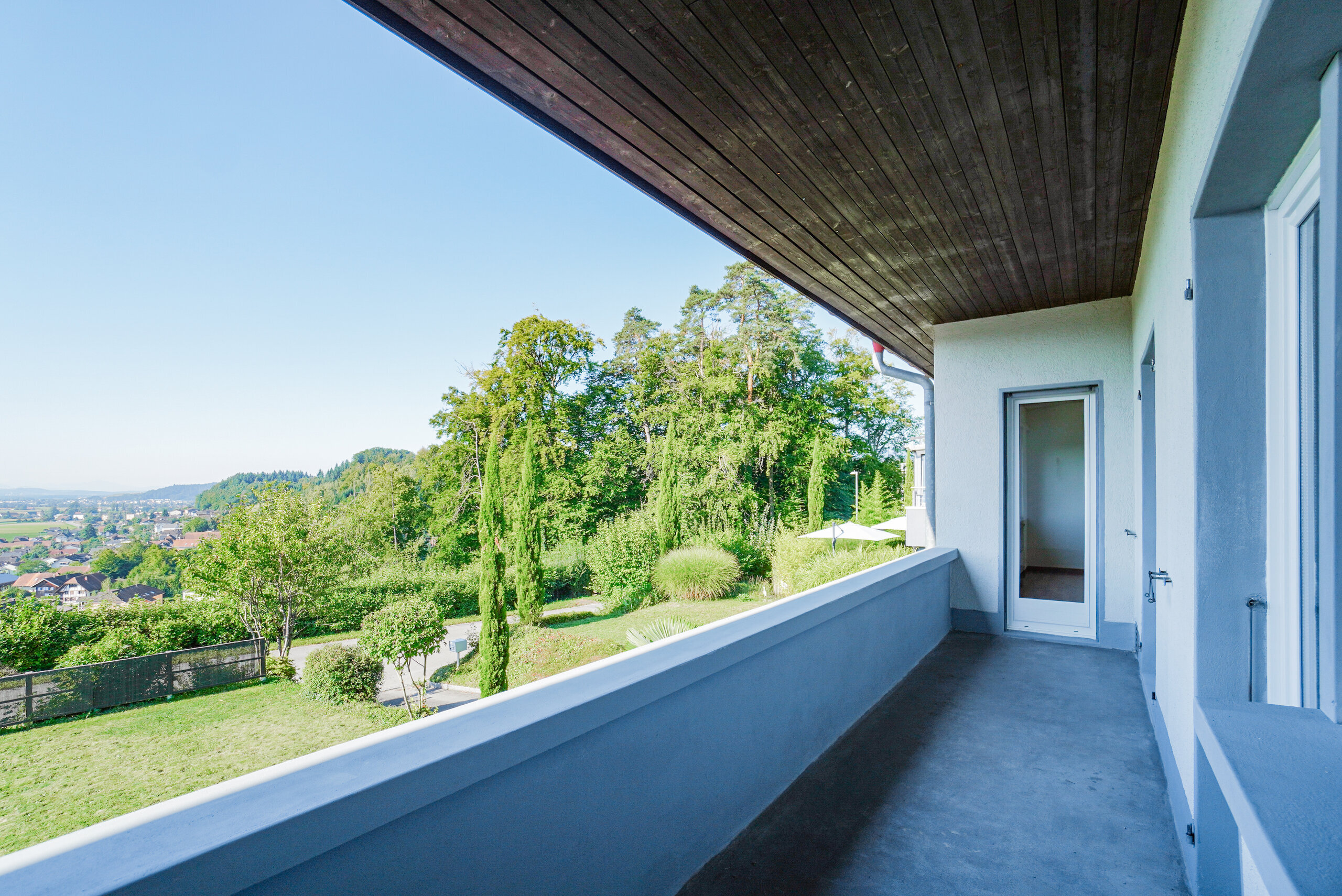 Der Aussenbereich beeindruckt mit einer modernisierten, vergrösserten Pergola, gepflegter Rasenfläche und vielfältigen Möglichkeiten zur individuellen Gartengestaltung. Vom Balkon, der vom Wohnzimmer und zwei weiteren Zimmern zugänglich ist, eröffnet sich ein herrlicher Panoramablick über die Berge und das Seeland.