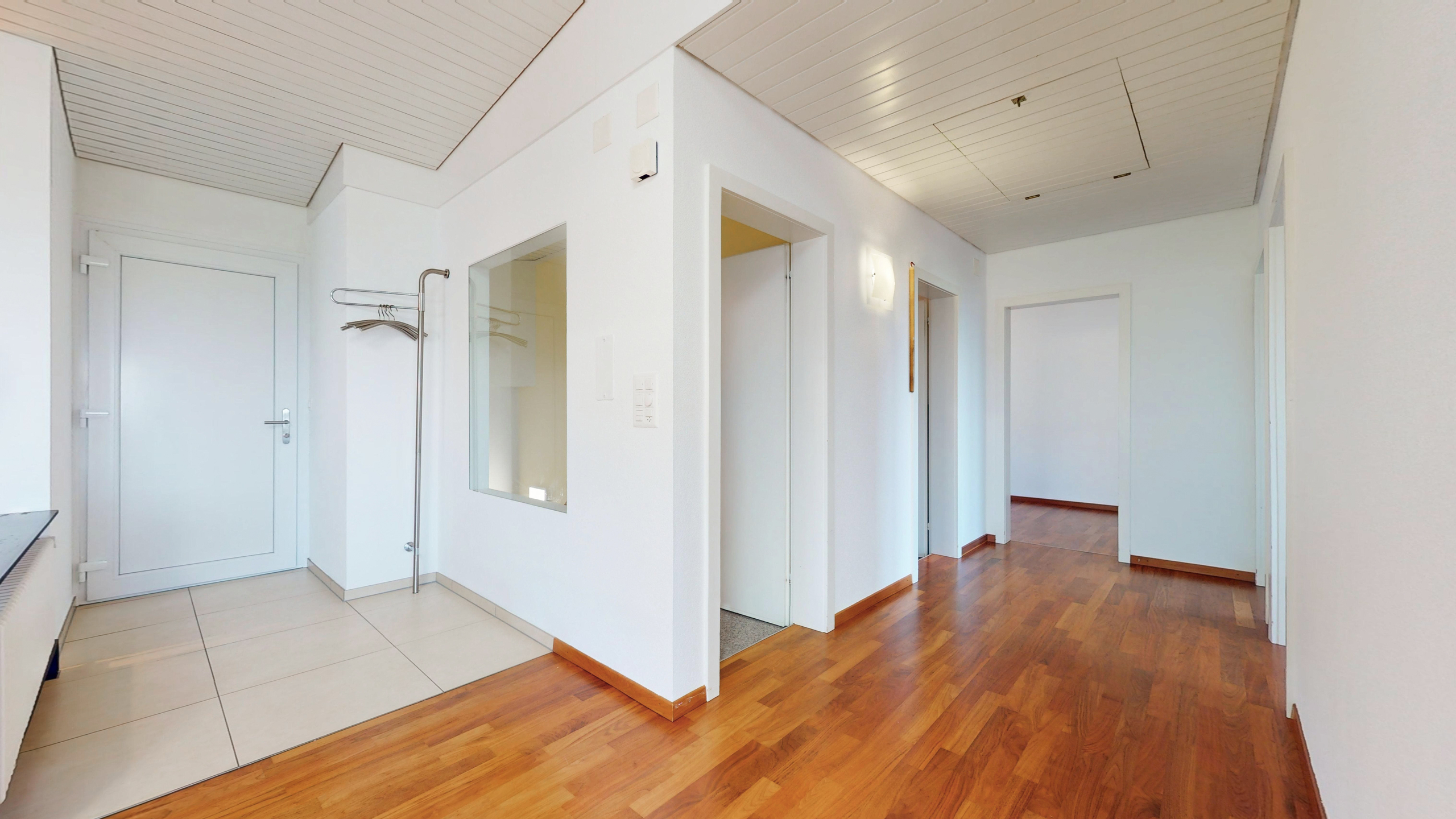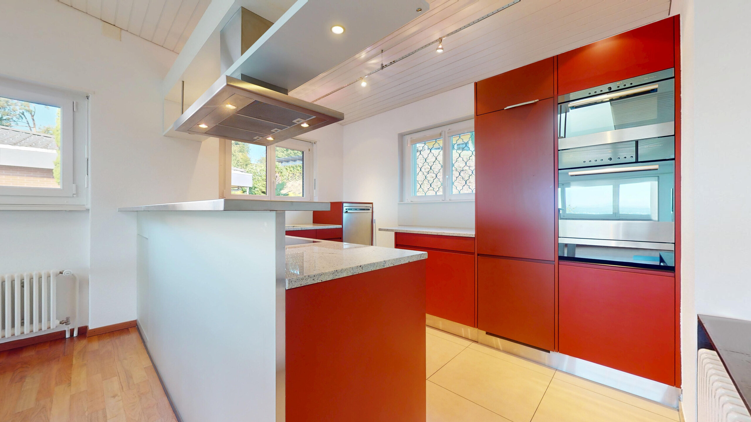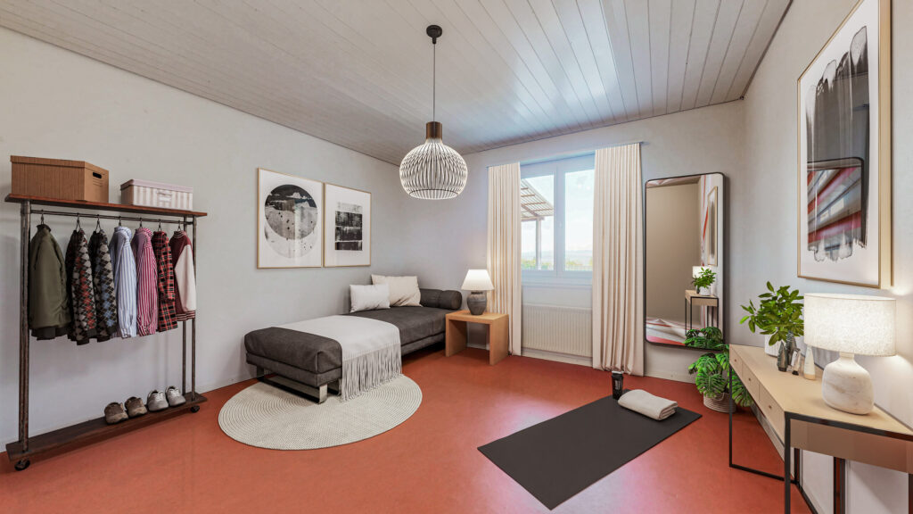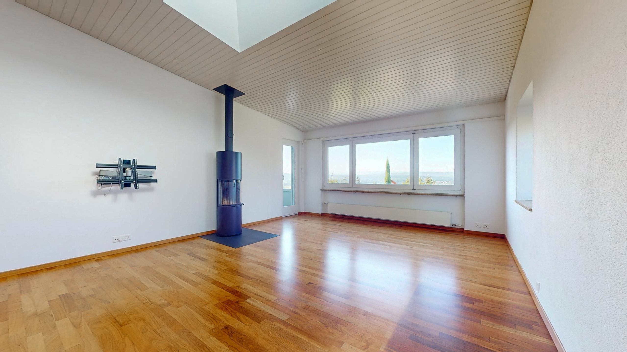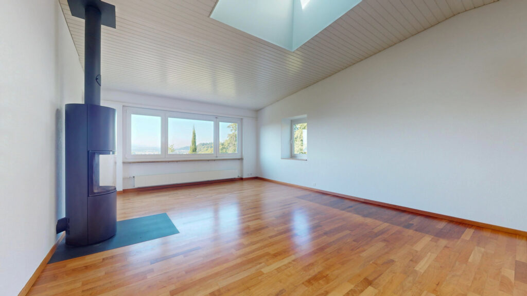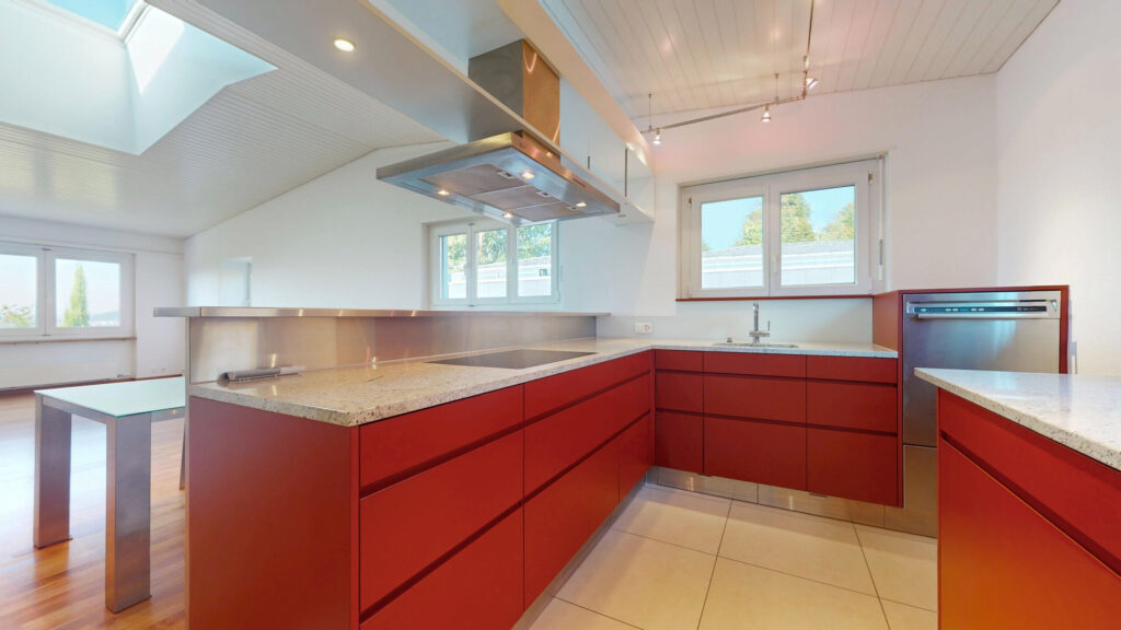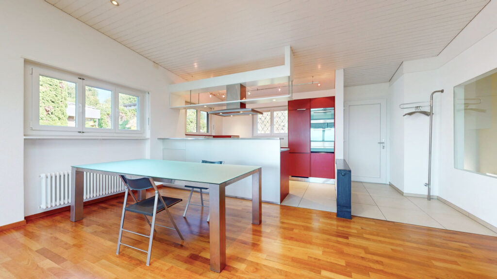 Der grosszügige Wohn- und Essbereich mit 41 m² besticht durch breite Fensterfronten und ein grossflächiges Dachfenster, das viel Tageslicht ins Innere bringt. Die moderne, halboffene Wohnküche mit Barteil fügt sich harmonisch in den Wohnbereich ein und eignet sich hervorragend für gesellige Stunden.