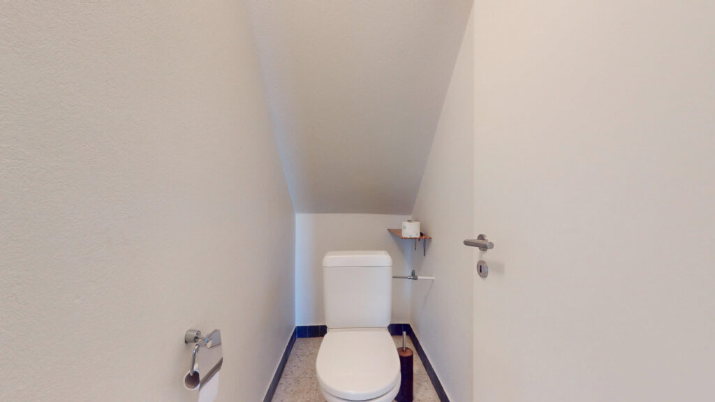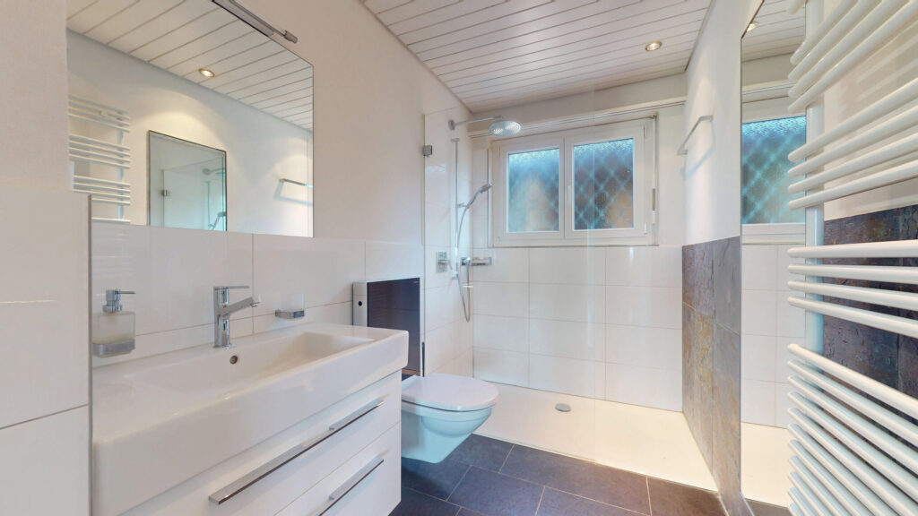 Die Nassbereiche sind ebenso komfortabel gestaltet: Ein Badezimmer mit Dusche/WC im Obergeschoss, ein weiteres Gäste-WC sowie ein Bad/Dusche im Erdgeschoss sorgen für Funktionalität im Alltag. Für besondere Entspannung sorgt der private Wellnessbereich mit Sauna und Kaltwasserbecken.