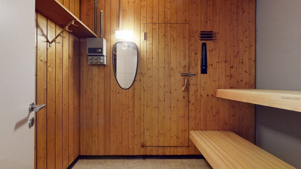 - Wellness: Zusätzlich zur Sauna ist ein Kaltwasserbecken verbaut