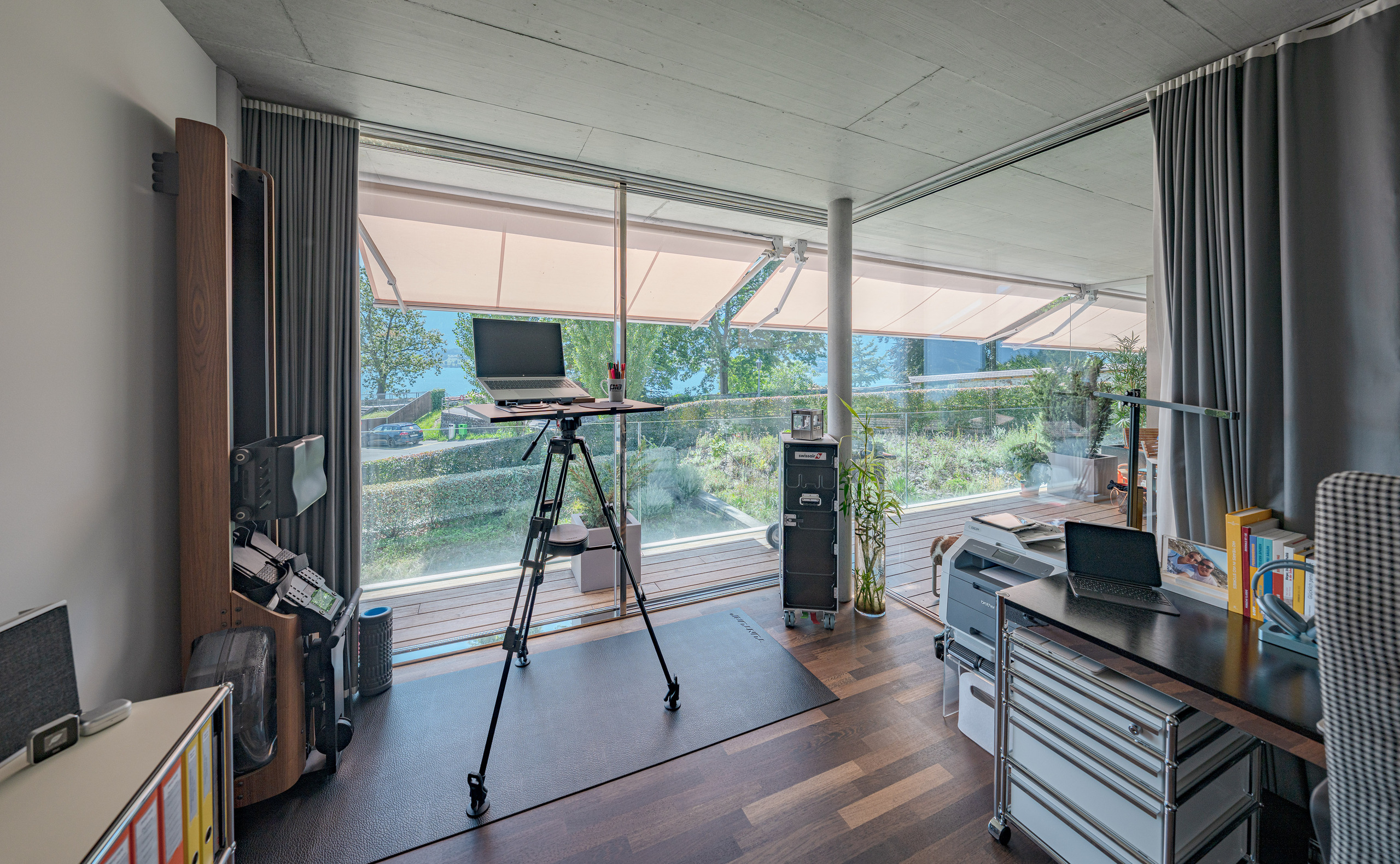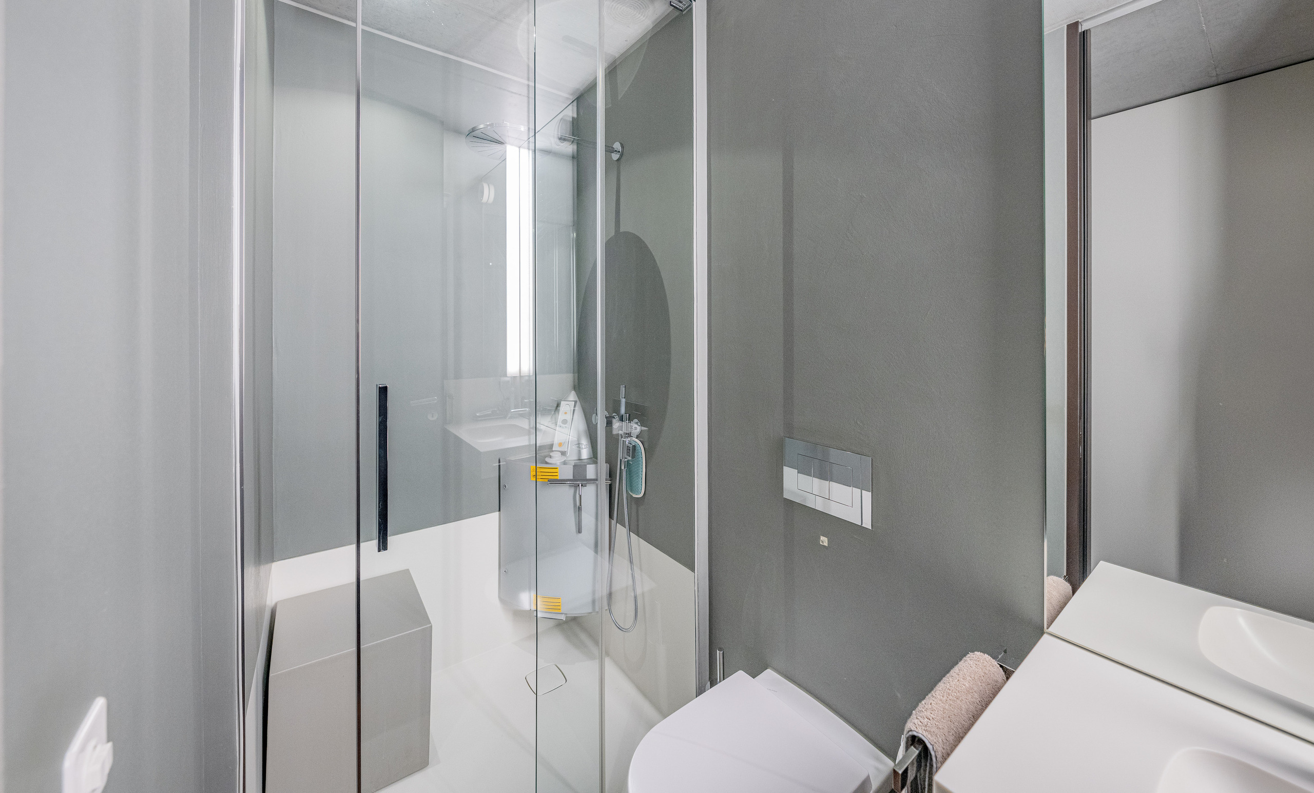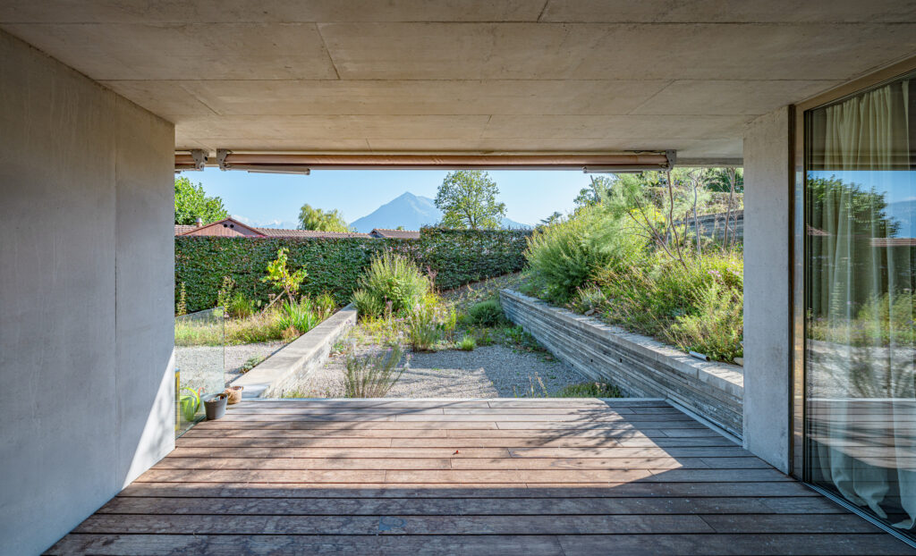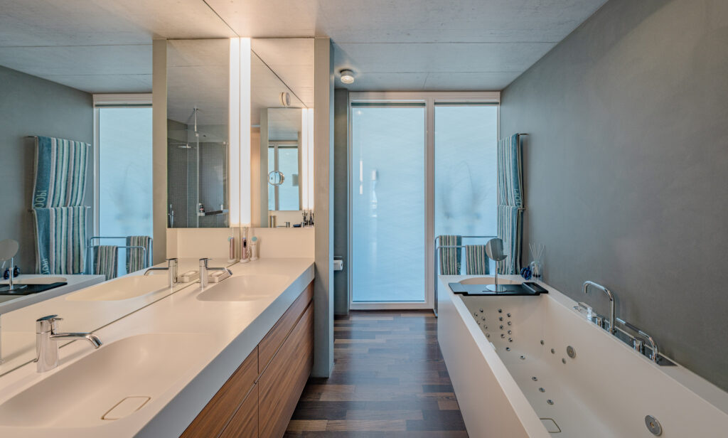 Das Interior lebt von der Kombination aus Sichtbeton, warmem Parkett und einzelnen weissen Wänden, die der Architektur eine unverkennbare Eleganz verleihen. Für höchsten Wohnkomfort sorgen exklusive Ausstattungsdetails wie Cheminée, Wellness-Badewanne, Dampfdusche, Komfortlüftung, elektrische Storen und Verglasungen der Schallschutzklasse 3.