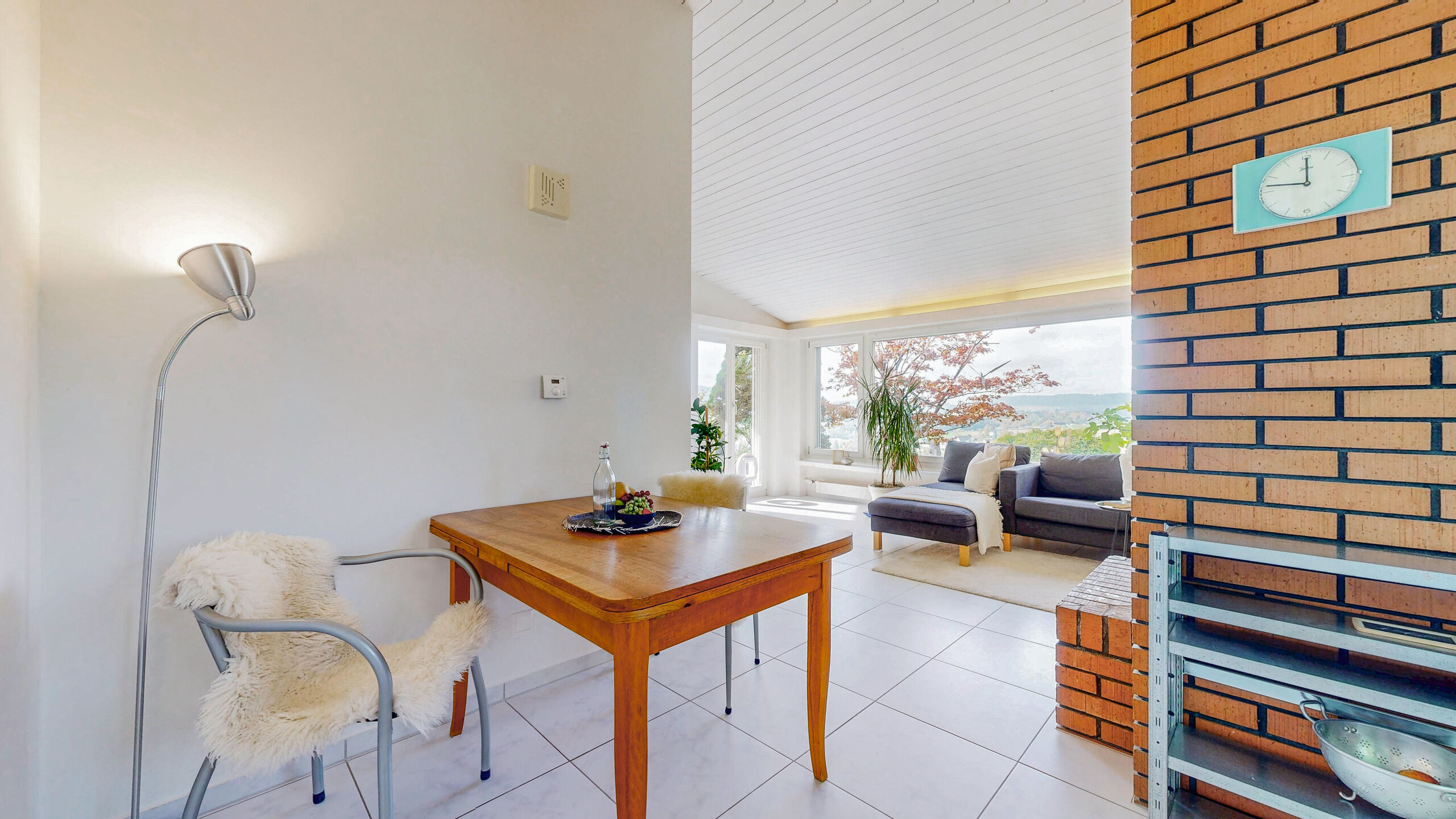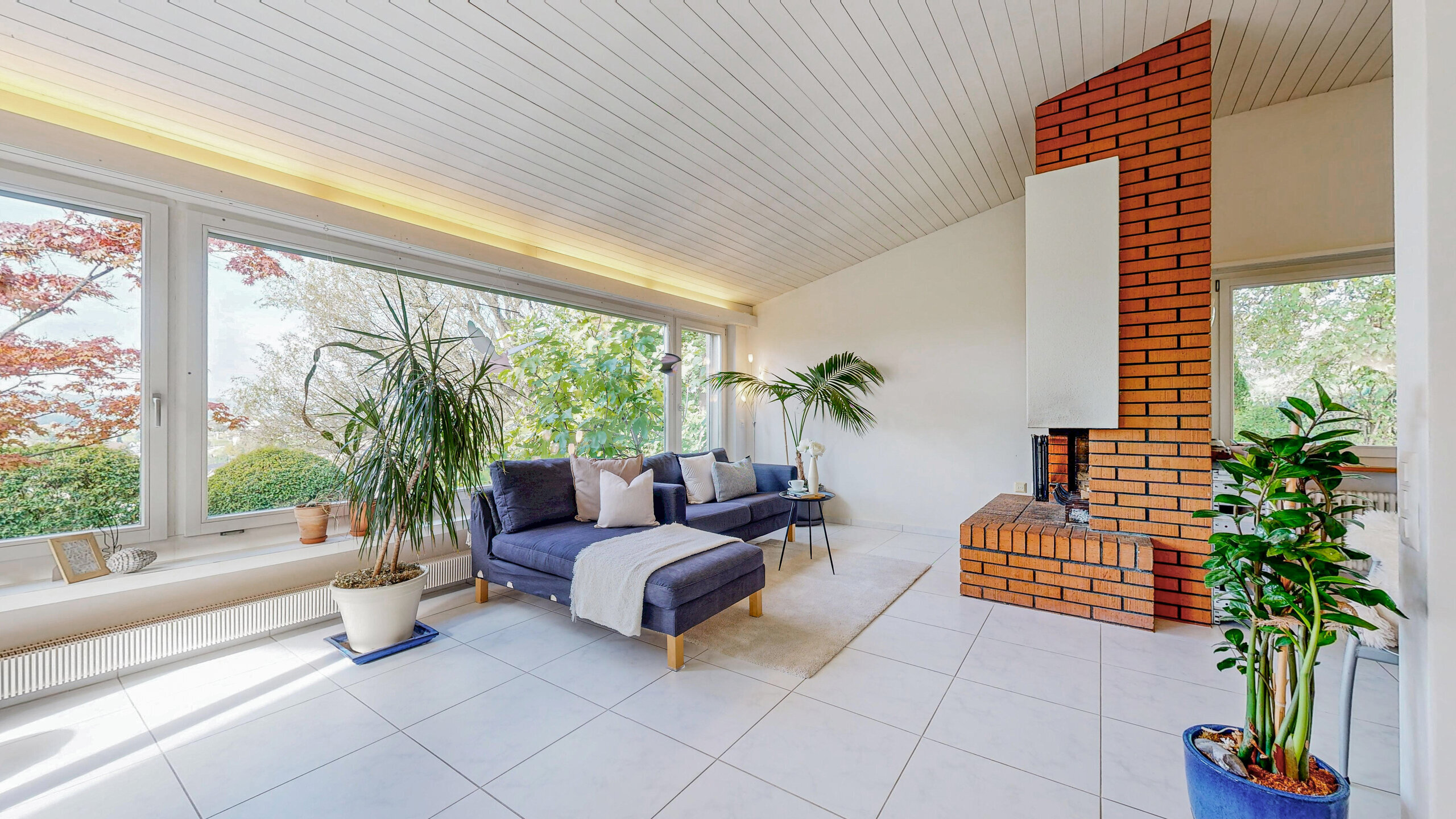 Im lichtdurchfluteten Wohnzimmer sorgt eine riesige Fensterfront für spektakuläre Weitblicke in die grüne Umgebung, während das Cheminée für gemütliche Stunden sorgt. Die hohen Räume verleihen dem Haus ein luftiges Wohngefühl.