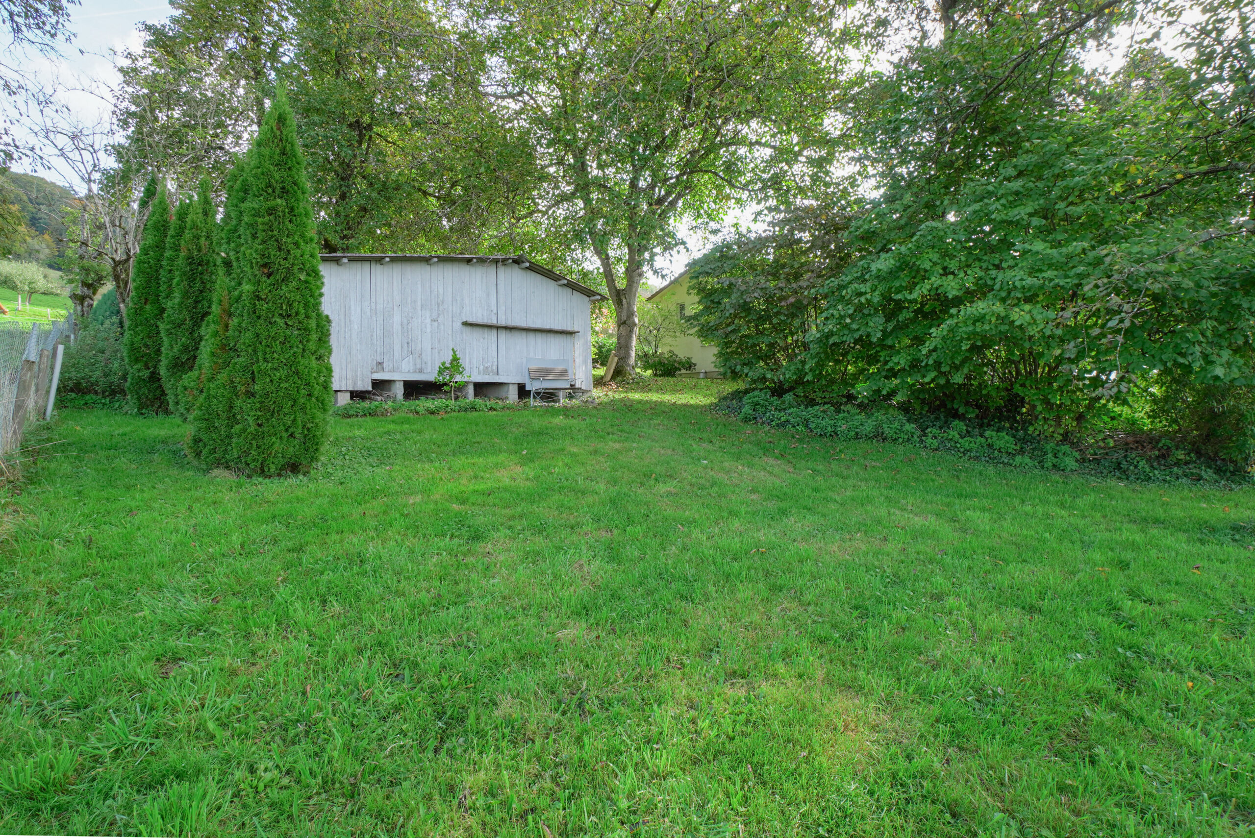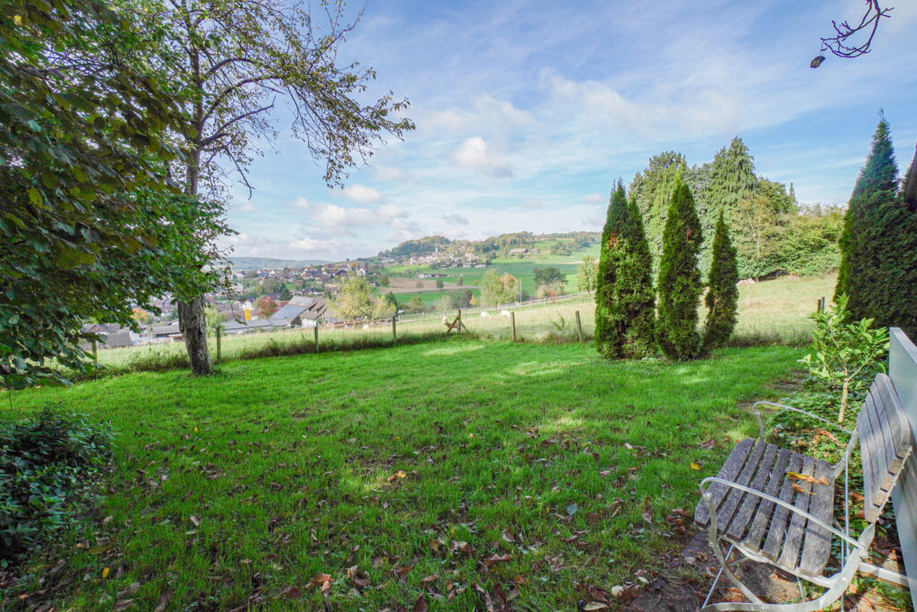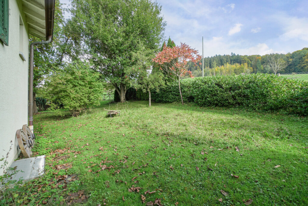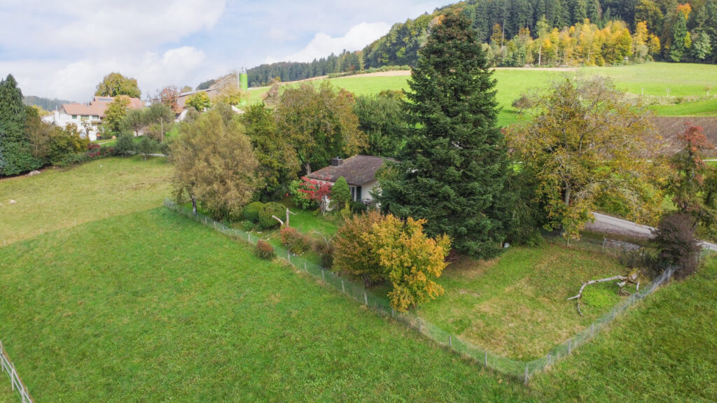 Im Aussenbereich lädt ein grosser, gedeckter Gartensitzplatz zum Entspannen ein. Die beeindruckende Parzelle von 1'838 m² eröffnet vielfältige Nutzungsmöglichkeiten – ob für Tierliebhaber, Gärtner oder einfach als ruhige Rückzugsoase.