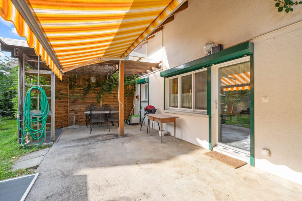 - Hausteil (weisse Fassade), ideal für Selbstnutzer oder als Mehrgenerationenhaus – mit zusätzlicher Vermietungsmöglichkeit im Anbau (Holzfassade)