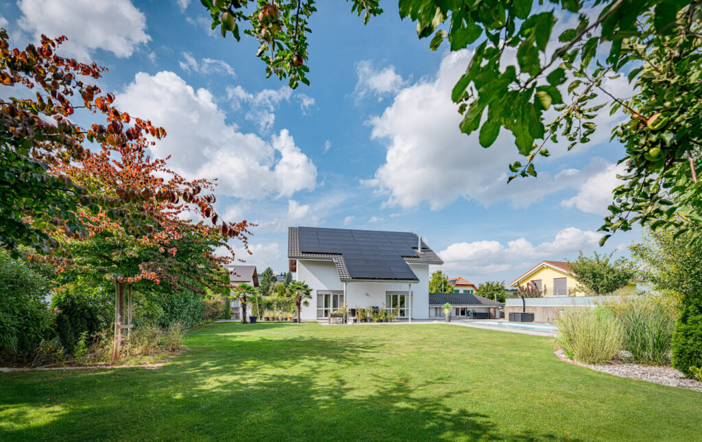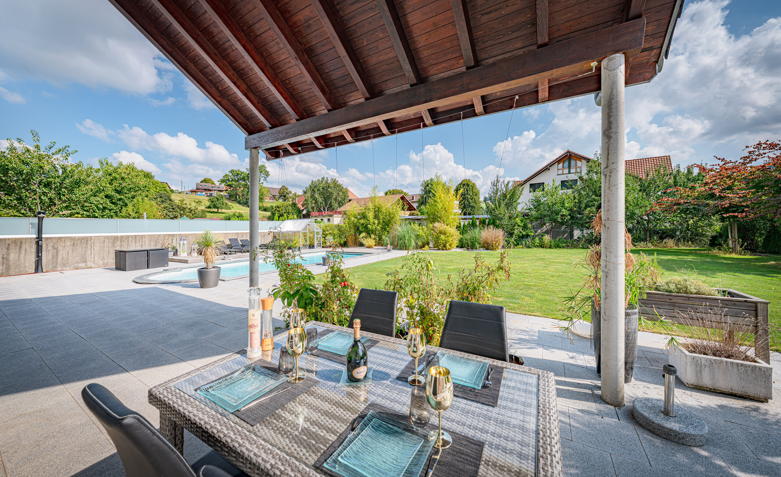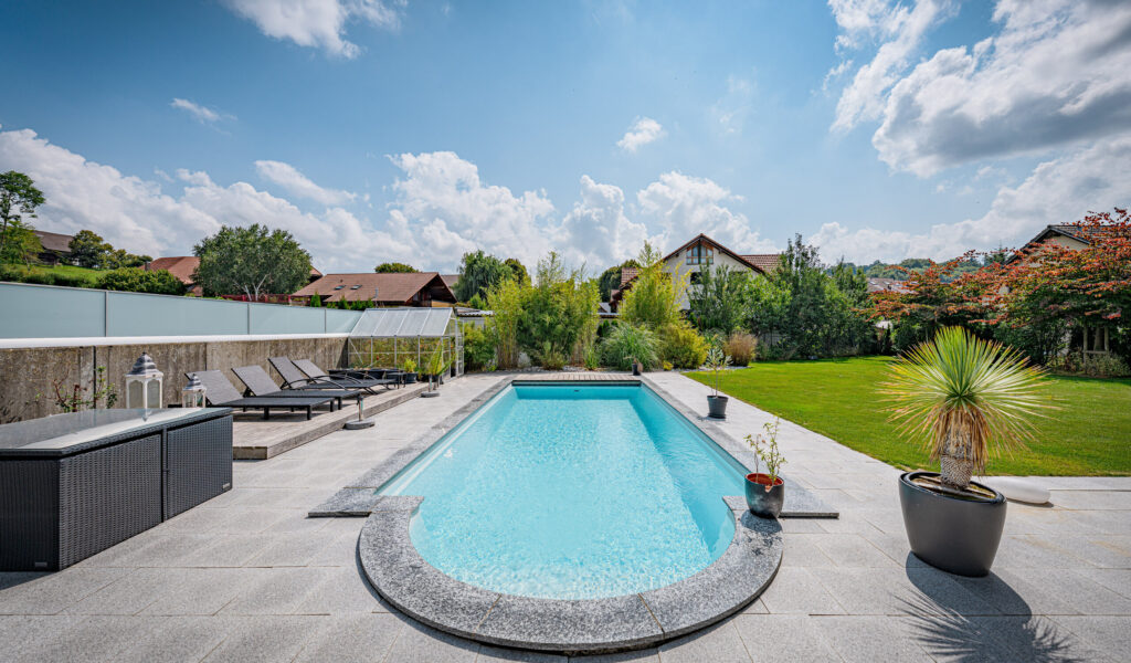 - Auch der Umschwung überzeugt: Imposantes Schwimmbad mit Sonnen-terrasse, süd- und westseitigem Gartensitzplatz sowie grosser Grünfläche mit vielfältiger Bepflanzung und Treibhaus