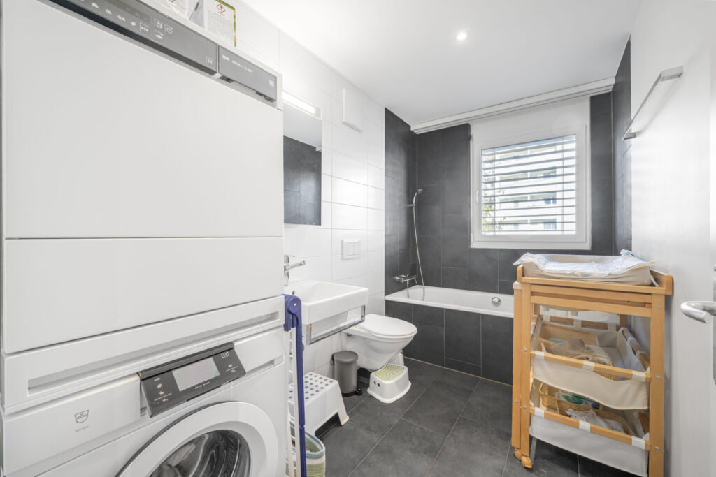 - Zwei grosszügige und hochwertige Nassbereiche: Bad/WC mit Waschturm und Dusche/WC