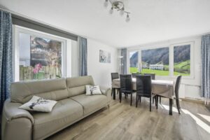 5.5-Zimmer-Ferienhaus mit 136 m² Wohnfläche und 55 m² Terrasse. Chalet-Charme mit rustikalen Holzelementen, zwei Nassbereiche mit Dusche/WC, offene moderne Küche. Viel Privatsphäre und Ruhe mitten in der Natur – ideal als Ferienhaus oder alpiner Rückzugsort.