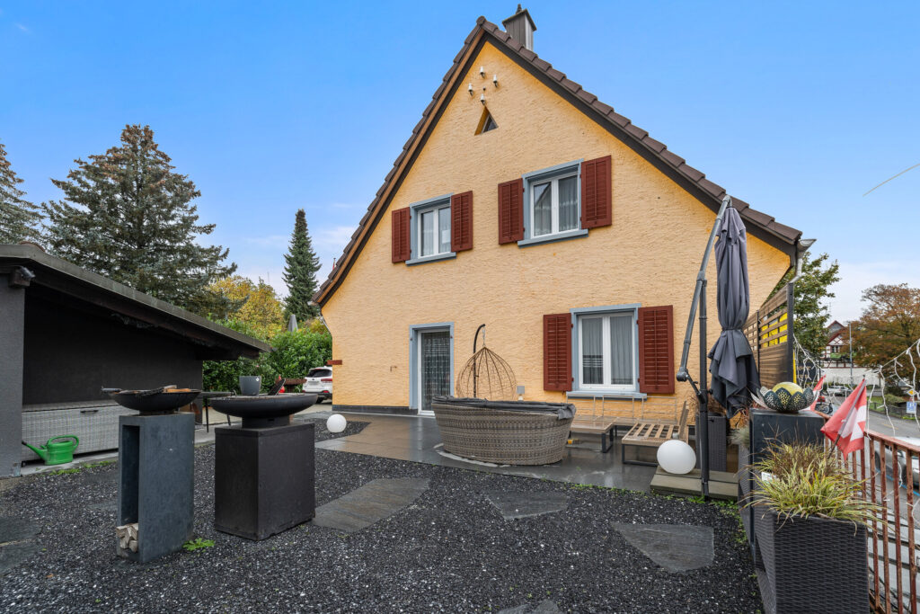 Freistehendes Einfamilienhaus mit 324 m² Gesamtnutzfläche: 146 m² Wohnen und 173 m² Gewerbe- und Nutzfläche. Offener Wohn-/Essbereich mit Cheminée, moderne Küche, ausgebauter Dachstock, drei Nasszellen. 40 m² vermietete Gewerbefläche mit CHF 12’000 Nettomiete p.a. und 101 m² Garage mit Werkstatt. Vier bis fünf Aussenparkplätze inklusive.