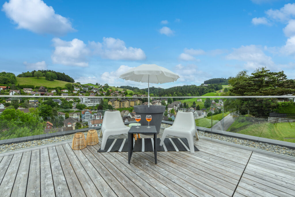 Exklusives 4.5-Zimmer-Einfamilienhaus in Herisau mit 161 m² Nutzfläche, offenem Wohn-/Essbereich, hochwertiger Küche, zwei eleganten Bädern, fast 40 m² Dachterrasse mit spektakulärer Aussicht, Sauna, verglastem Sitzplatz, Balkon, Terrasse und zwei Tiefgaragenplätzen.