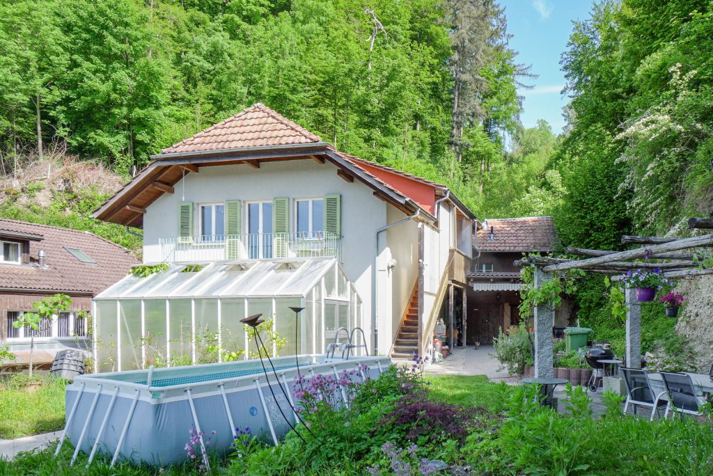 317 m², 9 Zimmer, zwei Wohnungen (3.5 & 5.5 Zi.), moderne Nassbereiche, grosse Küchen, Pergola, Garten mit Pool, Treibhaus, Brunnen. Nähe Burgruine Rohrberg, top ÖV-Anbindung.