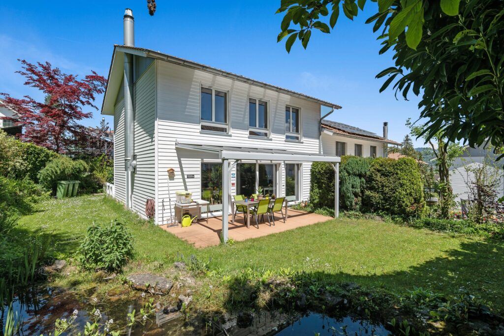 303 m², 7.5 Zimmer, offener Wohn-/Essbereich, Küche mit Kochinsel, Balkon & Terrasse, Garten mit Spielstrasse. Nachhaltige Bauweise (Photovoltaik, Wärmepumpe). Parkplatz inkl., Carport optional.