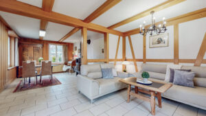 250 m² Gesamtnutzfläche auf 6.5 Zimmer verteilt. Heller Wohn- und Essbereich mit Cheminée, grosse Küche mit viel Stauraum, hohe Decken und angenehme Wohnatmosphäre. Praktische Nebenräume: Keller, zwei Abstellräume, Weinkeller, Waschküche. Viel Umschwung im Grünen. Parkierung: 1 Garagenbox + 2 Aussenplätze. Ruhige, zentrale Lage – ÖV in Gehdistanz