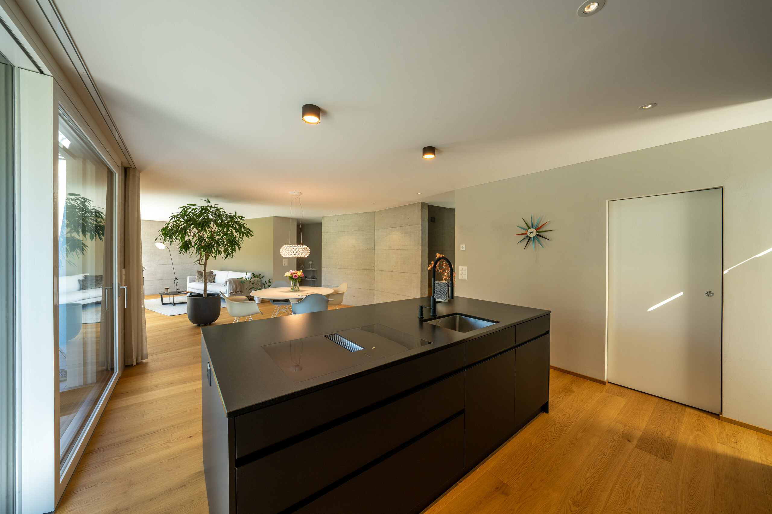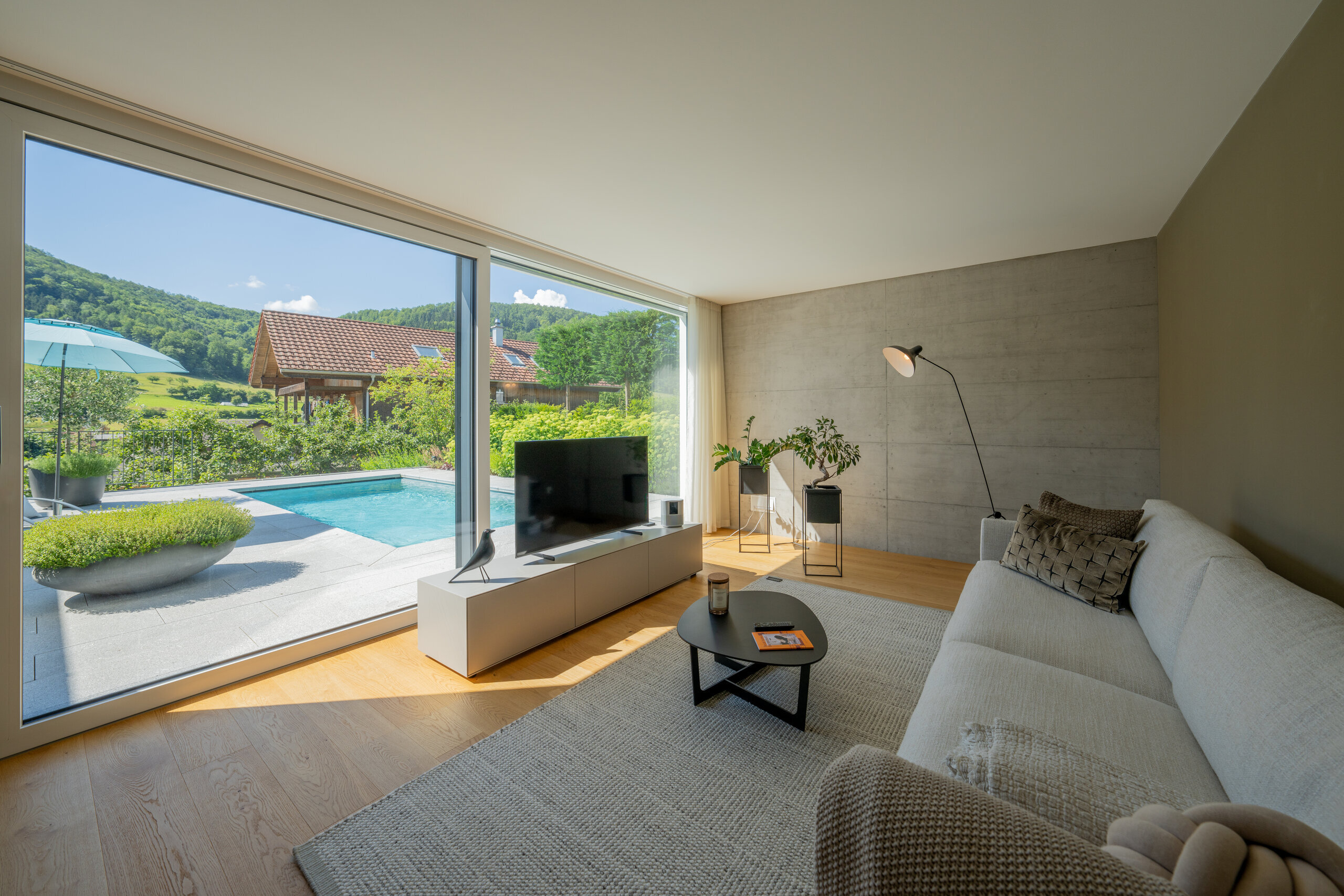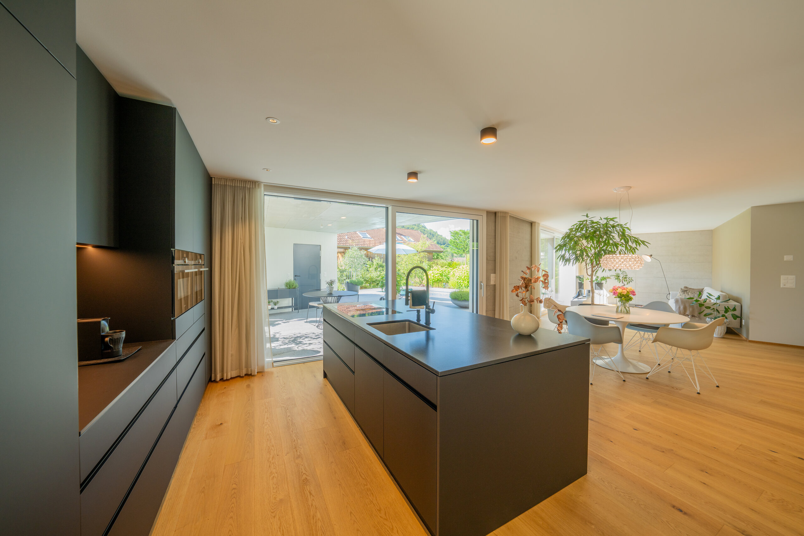 Der stilvolle Wohn- und Essbereich öffnet sich direkt zum überdachten Gartensitzplatz und zum Swimmingpool – ideal für entspannte Stunden im Freien. Die offene Küche in elegantem Schwarz mit zentraler Kochinsel ist modern ausgestattet und wird höchsten Ansprüchen gerecht.