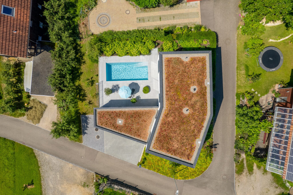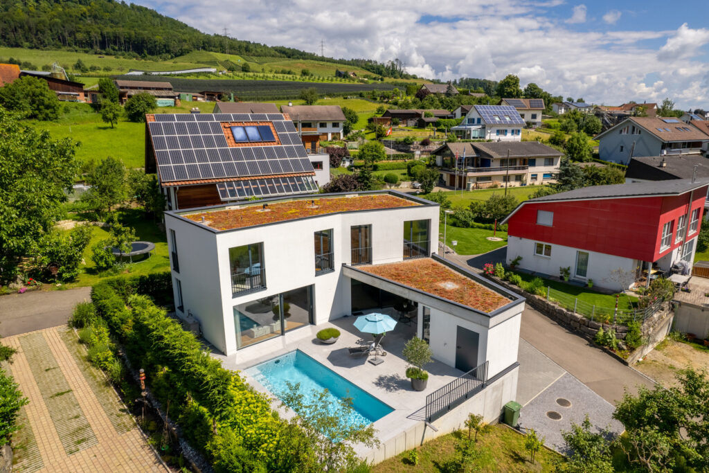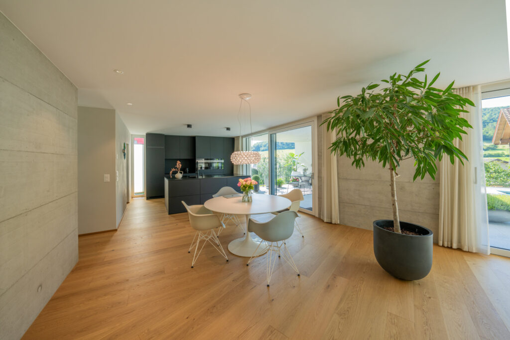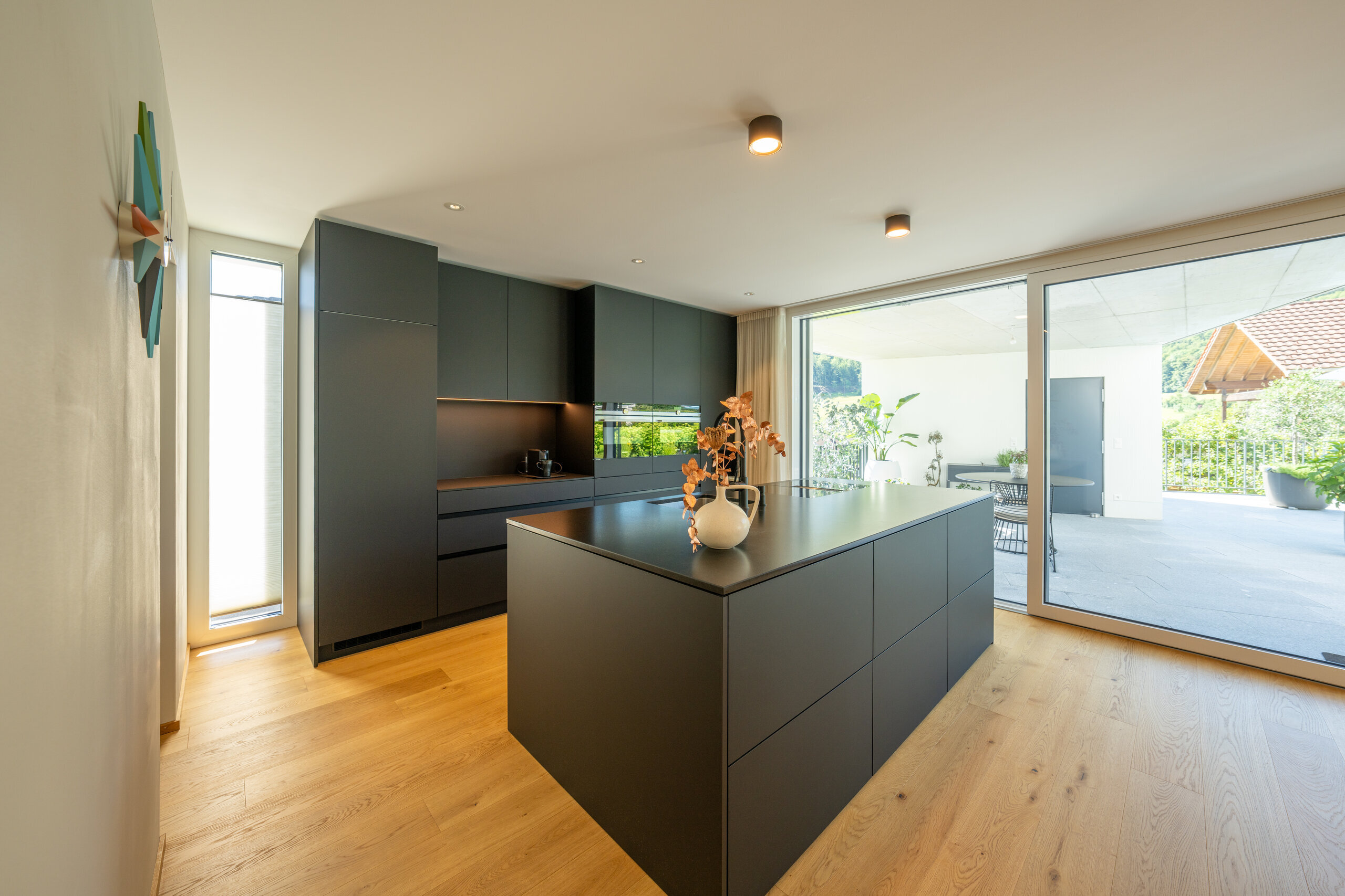 Der stilvolle Wohn- und Essbereich öffnet sich direkt zum überdachten Gartensitzplatz und zum Swimmingpool – ideal für entspannte Stunden im Freien. Die offene Küche in elegantem Schwarz mit zentraler Kochinsel ist modern ausgestattet und wird höchsten Ansprüchen gerecht.