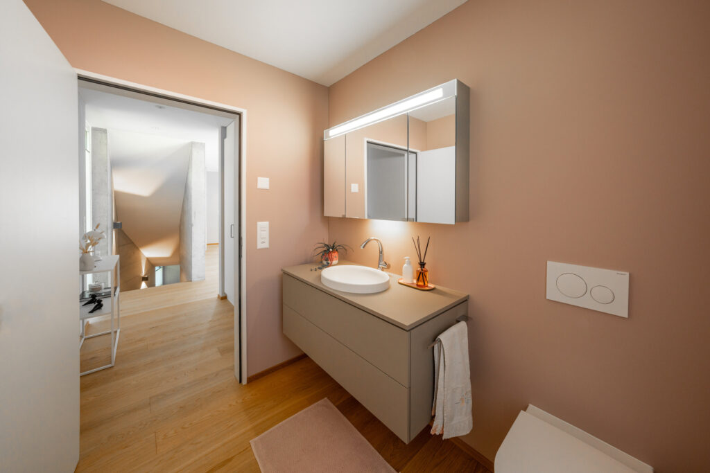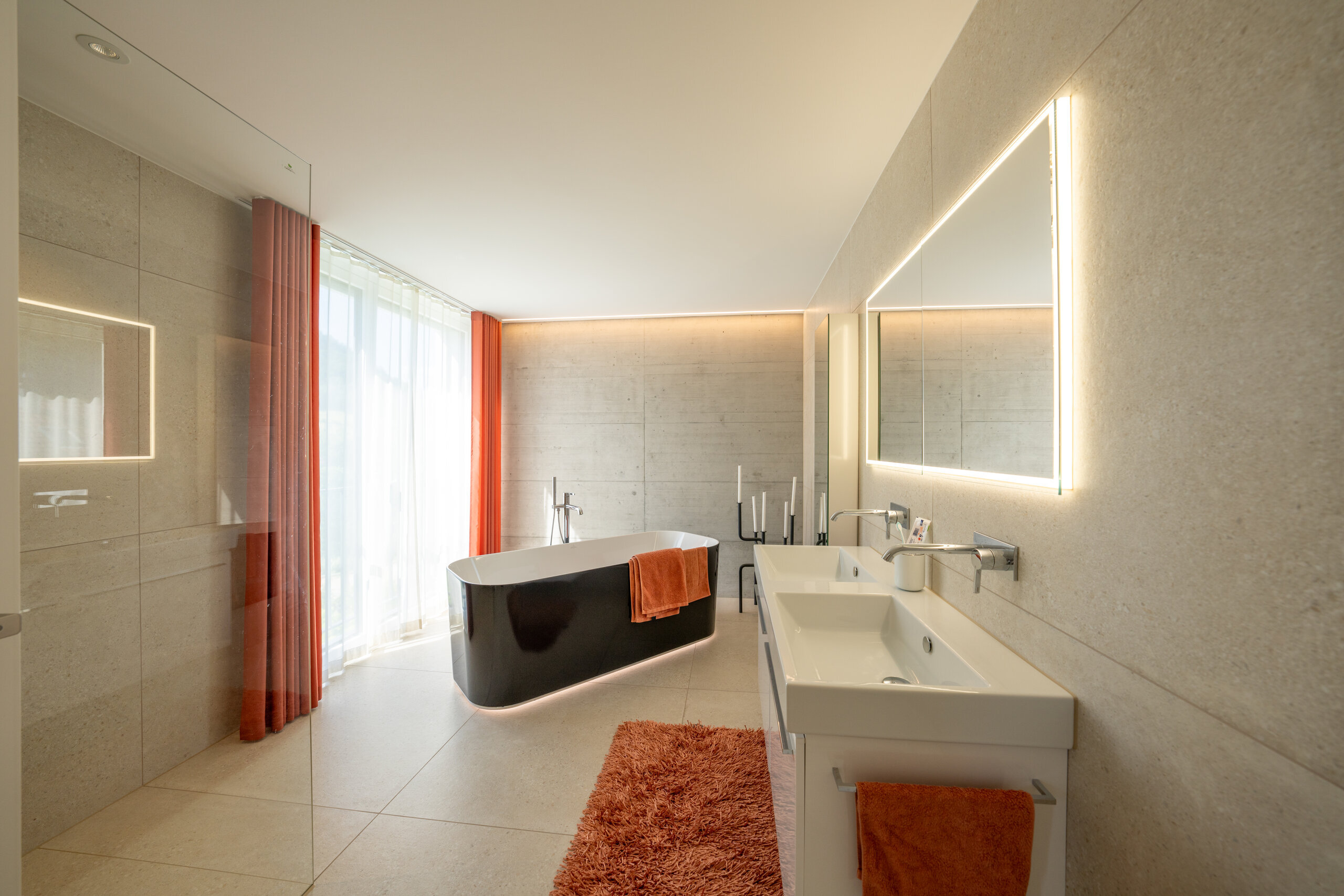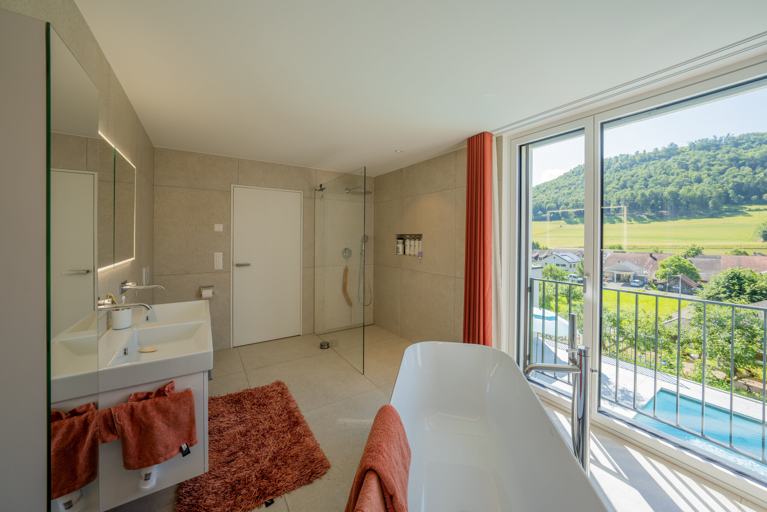 Geschmackvoll gestaltete Nassbereiche, darunter ein Badezimmer mit freistehender Badewanne, Dusche und WC sowie eine separate Gästetoilette, unterstreichen die hochwertige Bauweise. Ergänzt wird das Platzangebot durch praktische Nebenräume wie einen separaten Raum beim Eingangsbereich, ein Reduit bei der Küche sowie einen Technik- und einen Hauswirtschaftsraum.