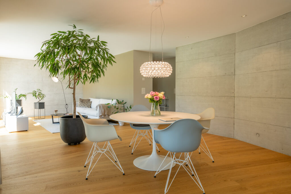 - Stilvoller Wohnbereich: Stilvoller Wohn- und Essbereich mit direktem Zugang zum Gartensitzplatz und zum Swimmingpool.