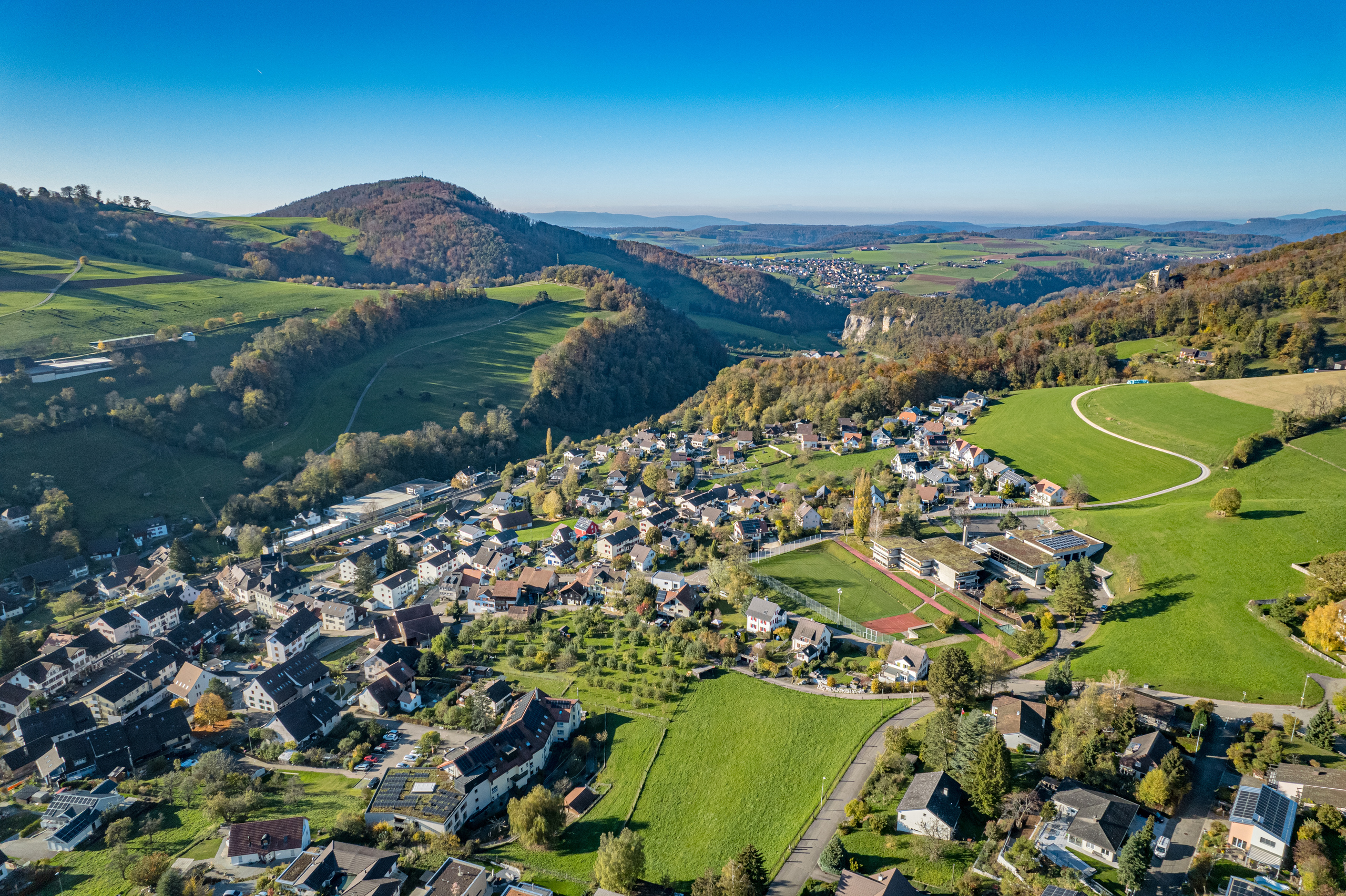 Läufelfingen überzeugt mit einer vorteilhaften Lage: Der nahegelegene Bahnhof gewährleistet eine optimale Anbindung an den öffentlichen Verkehr, während die Autobahn A2 schnell erreichbar ist. Naturliebhaber schätzen zudem die idyllische Umgebung, die dennoch in gut erreichbarer Distanz zu städtischen Zentren liegt.